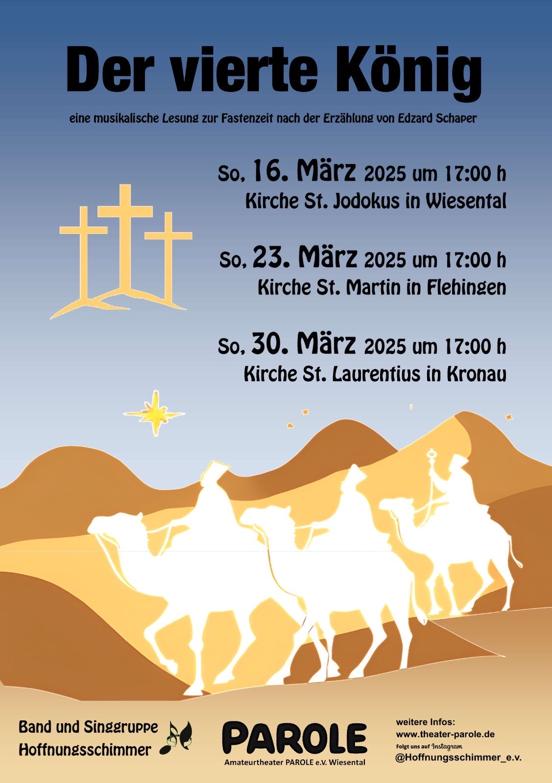 Eine musikalische Lesung zur Fastenzeit nach der Erzählung von Edzard Schaper (vorgetragen von der Theatergruppe „Parole“, musikalisch gestaltet von „Band und Singgruppe Hoffnungsschimmer“).